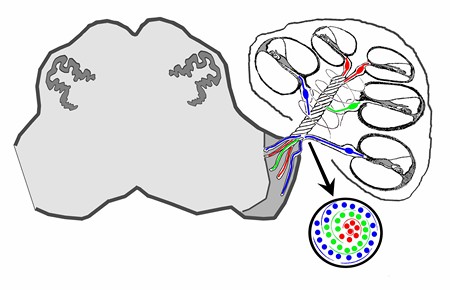 O nervo auditivo origina-se nos neurónios do gânglio espiral da cóclea, desde do ápice até à base. O nervo ocupa a parte central do modíolo coclear. Este nervo estrutura-se em camadas sucessivas: as fibras mais profundas (vermelhas) provéem do ápice, estando envolvidas pelas da espira média (verde) e as mais periféricas originam-se na espira basal (azul). Desta forma, a tonotopia coclear mantem-se também no nervo.